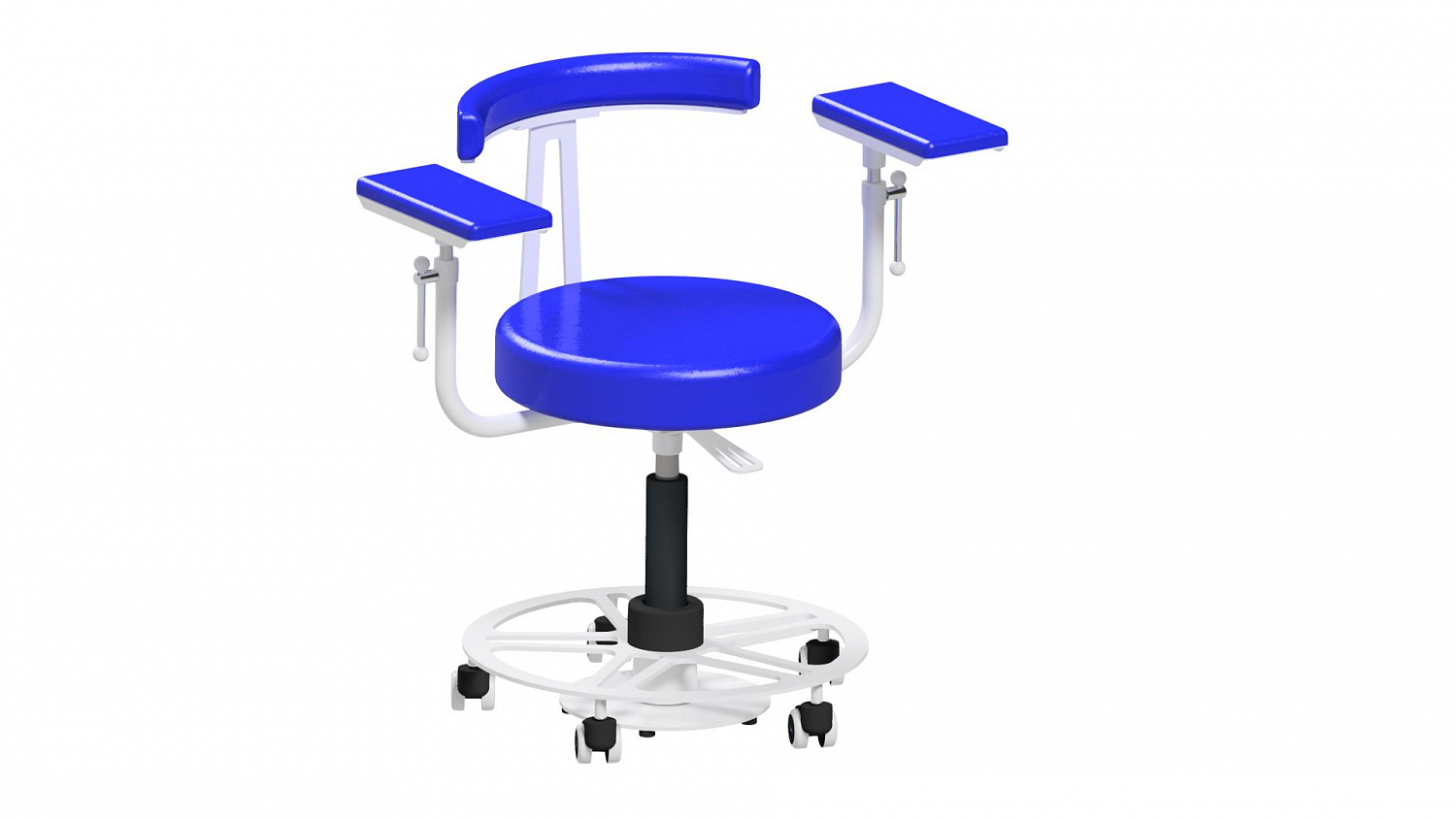 Крепления подлокотников изготовлены из нержавеющей стали и фиксируются стопорными винтами. Стул оснащен прижимной пластиной, которая препятствует самопроизвольному перемещению. Для перемещения стул снабжен пятью поворотными колесными опорами Ø50 мм. Каркас имеет полимерно–порошковое покрытие. Сидение, подлокотники и спинка из пенополиуретана обтянутого винилискожей. Цвет по согласованию (стандартный цвет — синий).